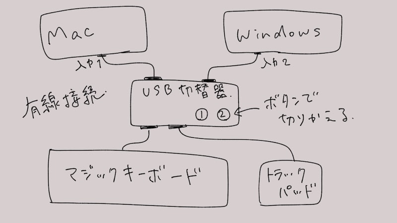 まず、Magic KeyboardはBluetooth対応ですが、複数のデバイス間で接続を切り替える機能がありません。一方の接続を切ってから、次に使うデバイスに切り替える形になります。これに関しては、例えばWindowsのほうは有線で、Macは無線で使うなどの工夫をする人が多いようです。私は、USB切替器に有線で接続してスイッチで切り替えていました。