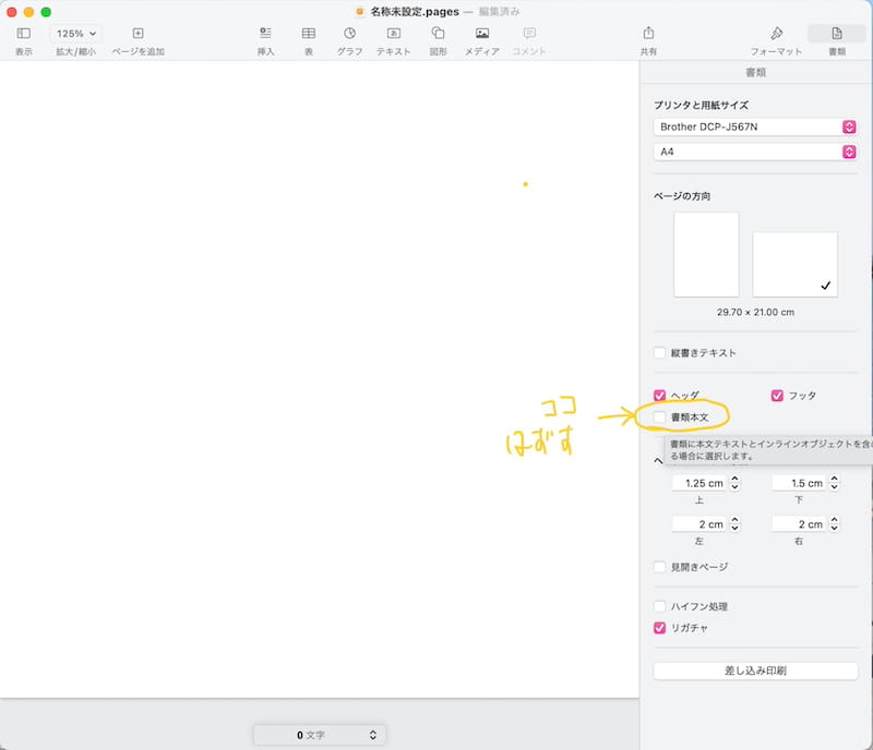 まずはA4横向きで新規ファイルを作り、右上の「書類」という部分をクリックし、真ん中あたりの「書類本文」のチェックを外します。こうすると本文の入力がなくなる代わりに、表や図形、テキストボックスを自由に配置できるようになります。