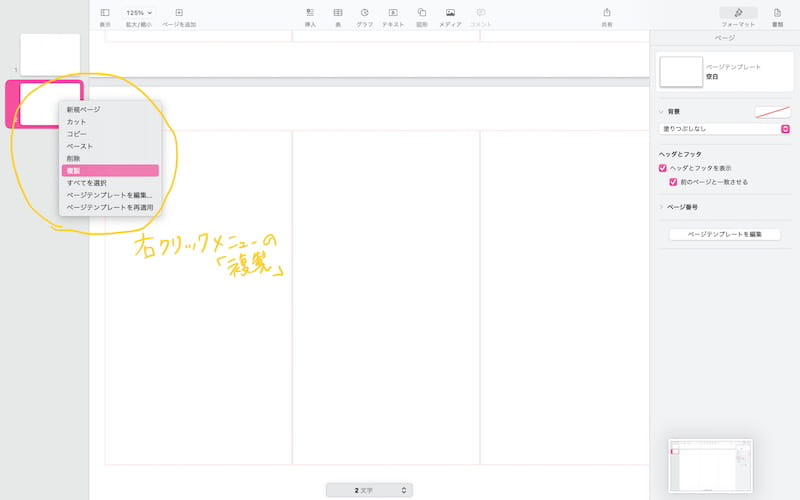 その後、左側のサイドバーでサムネイルを表示して、今作成したページを複製します。これで短辺とじで裏表印刷したときに、裏と表の枠がきれいに重なるはずです。テスト印刷するなら、印刷設定で裏表印刷の部分を「オン(短編)」にしてください。