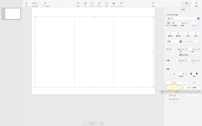 リフィルは裏表印刷なので、裏側がぴったり表側に合うように配置を整えます。左右の余白が同じになっていることを確認したら、3つの枠線を複数選択して「フォーマット」の配置タブの下の方にグループというのがあるのでそれでグループ化します。これで3つの枠がひとつのオブジェクトとして扱われるようになりました。