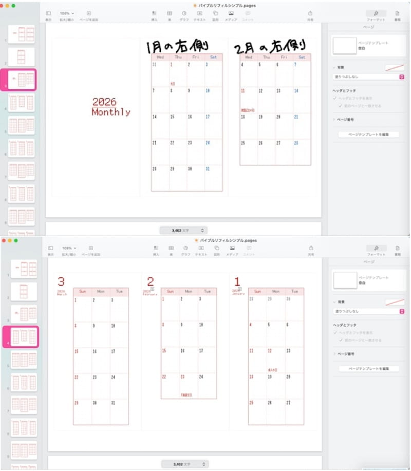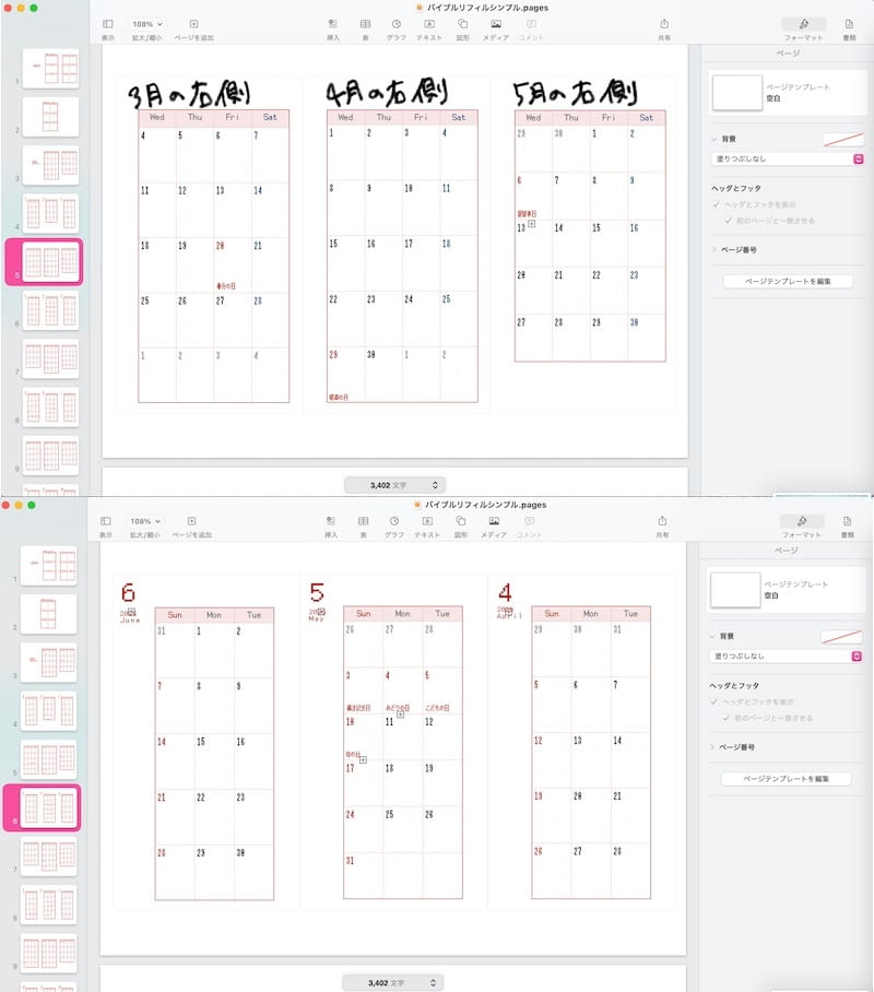 バイブルサイズの場合は、A4用紙に3枚分のリフィルを配置して印刷し、裁断して穴あけを行うという流れになります。ここではMacのPagesを使ったリフィルデータの作り方を紹介します。