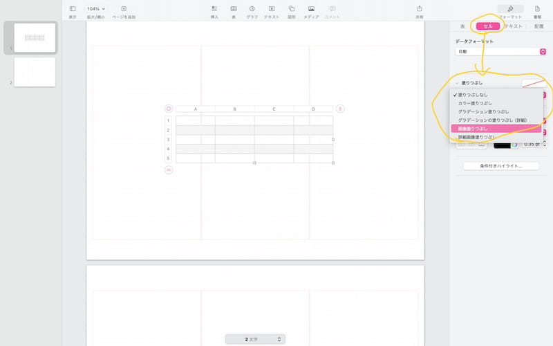 紙の余白部分をクリックした状態で、右上の「フォーマット」で背景「塗りつぶしなし」というプルダウンで「画像塗りつぶし」を選択、使いたい方眼紙の画像を選ぶ。スケールは元のサイズで。