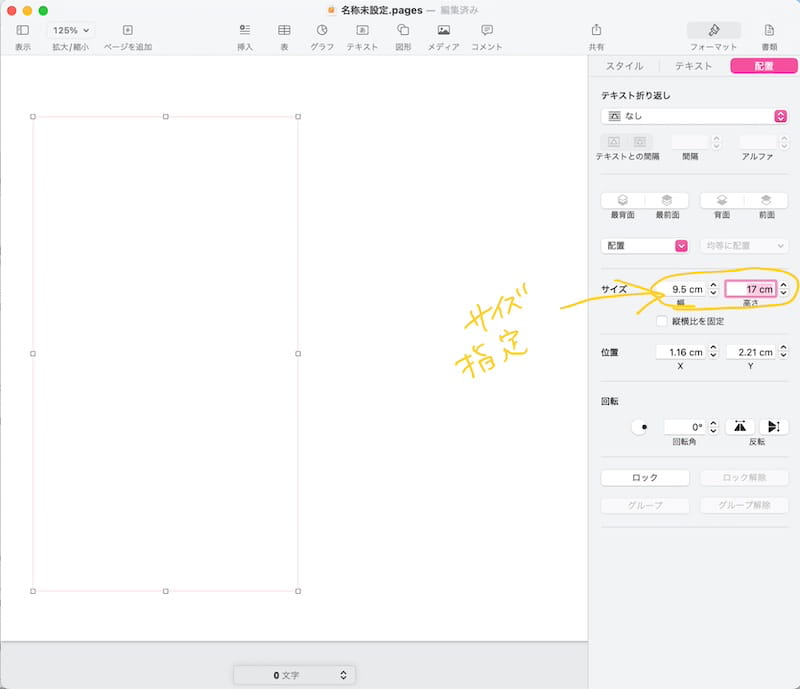 配置タブに移動して、サイズの部分で枠の大きさを指定します。バイブルサイズのリフィルはだいたい縦170mm×横95mmです。画像では単位がcmなので、17×9.5で指定しています。これをコピペして3つきれいに並べます。