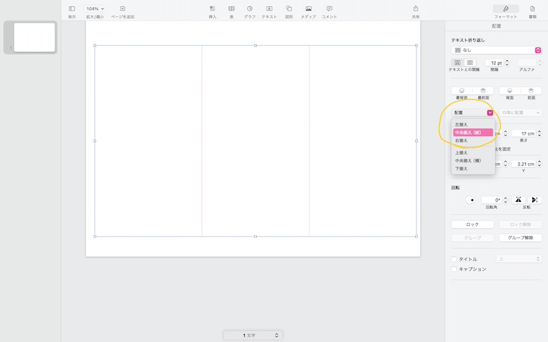 そうしたらこのグループ化した枠を選択して、少し上のほうの配置というプルダウンから「中央揃え(縦)」を選びます。