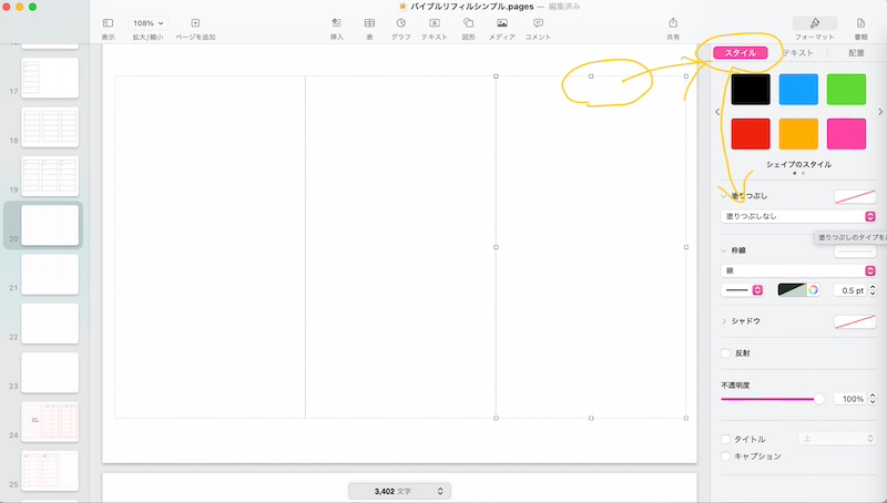 オリジナルリフィル作成に必要な道具です。この記事ではMacのPagesを使って作ります。iPhoneやiPadのPagesでもできるかどうかは確認していませんのでご了承ください。