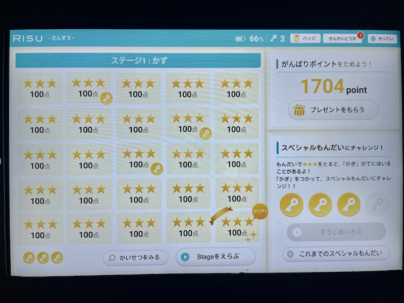 RISUは、ステージ画面に各パートの点数がズラッと並びます。100点が並ぶと気持ちいいので、間違ったときは100点になるまで解き直すクセがつきました。間違えた部分を見直すのはとても重要なので、このデザインはよく考えられていると思います。