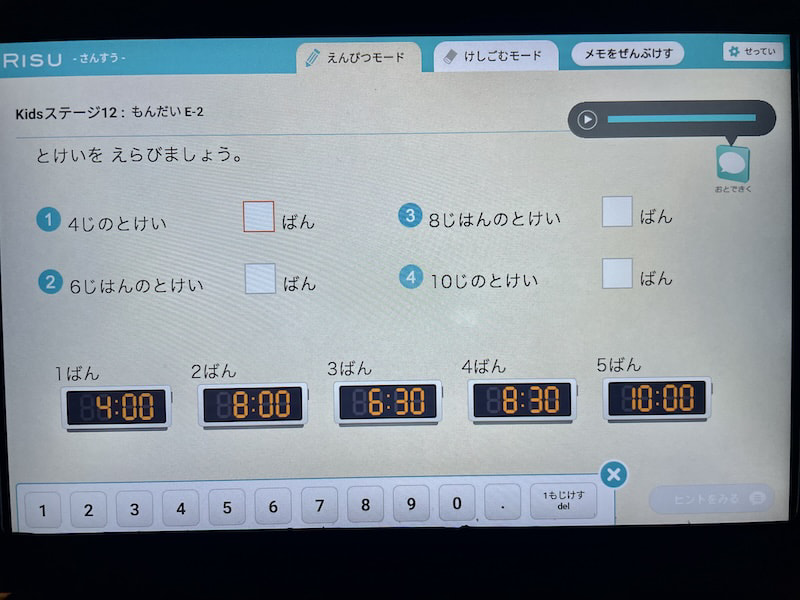 ただ、実際の問題の中には、選択肢や問題の中身にも文が含まれていることがあります。上の画像では◯じのとけいという部分は読み上げがないため、息子が「これ、なんて書いてあるの?」とタブレットを持ってきて聞きにくる場面もありました。問題文以外の説明部分にも読み上げがあると、より自分で進めやすくなるのではないかと思います。